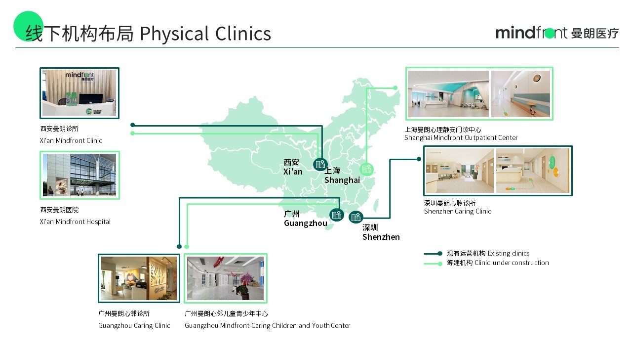 目前,曼朗医疗已于上海、广州、深圳和西安四地开设精神心理专科医疗机构,同时提供精神科诊疗、心理咨询/治疗、团体治疗、艺术治疗及心理课程等专业服务。依托线下医疗机构,曼朗医疗于2021年取得互联网医疗服务资质,并自主研发上线了Mindfront小程序、曼朗APP(用户端、专业端)等,提供线上和线下整合的全程医疗服务。